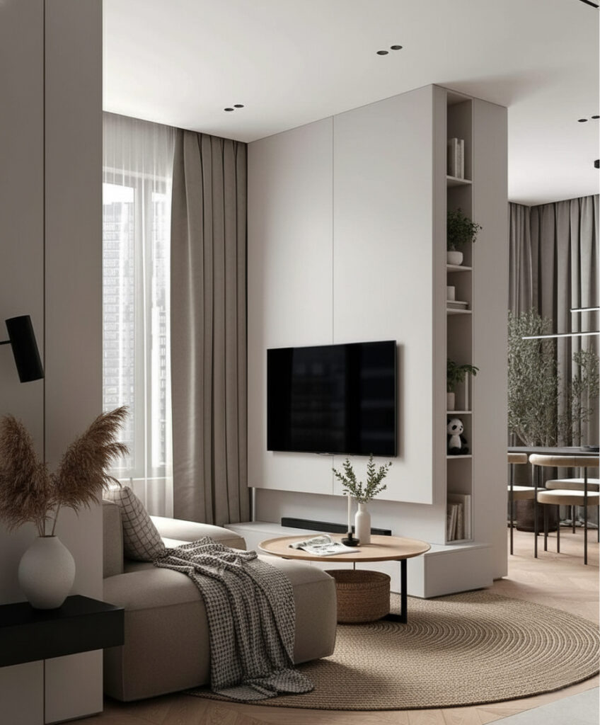 Living room including wall decoration, and built-in furniture.
